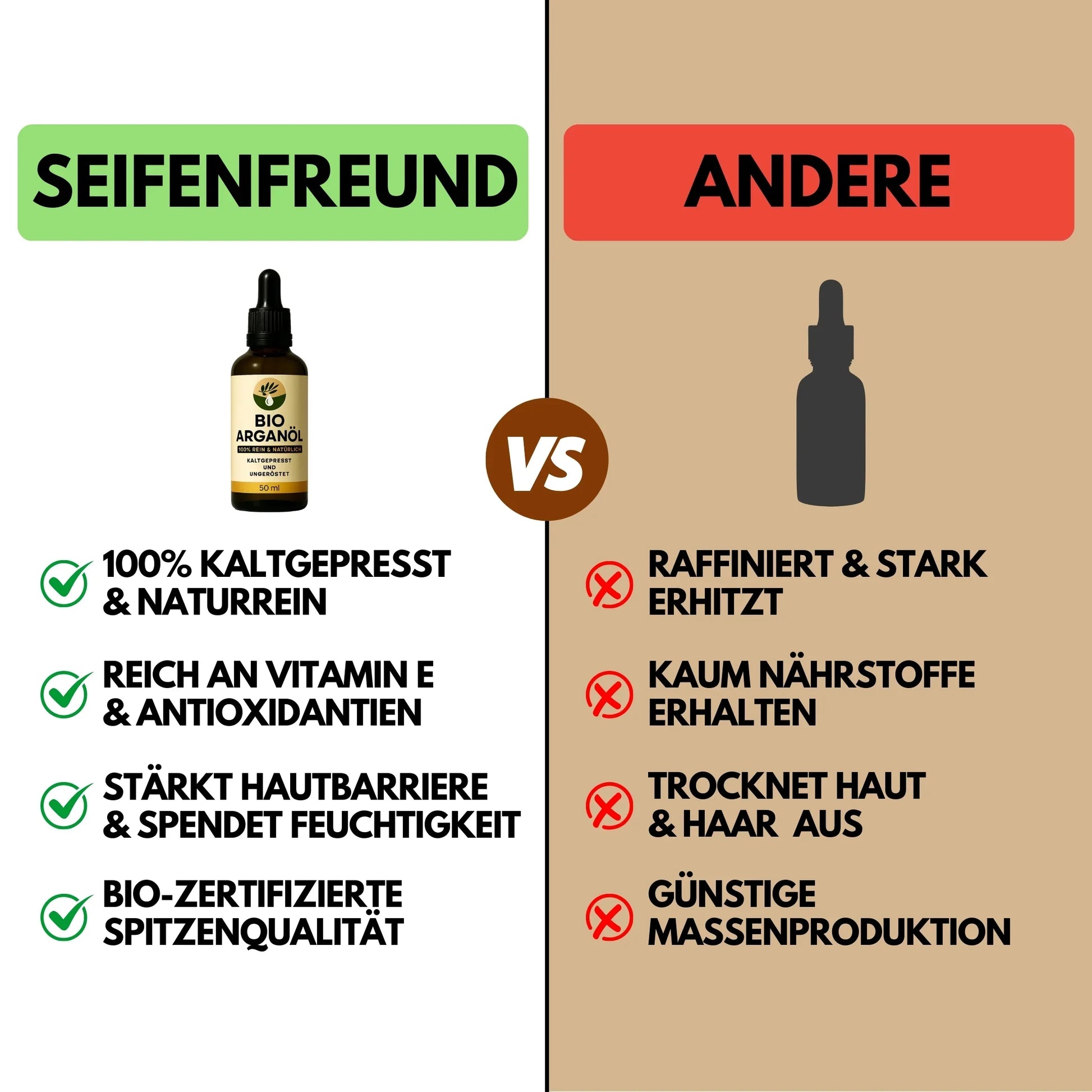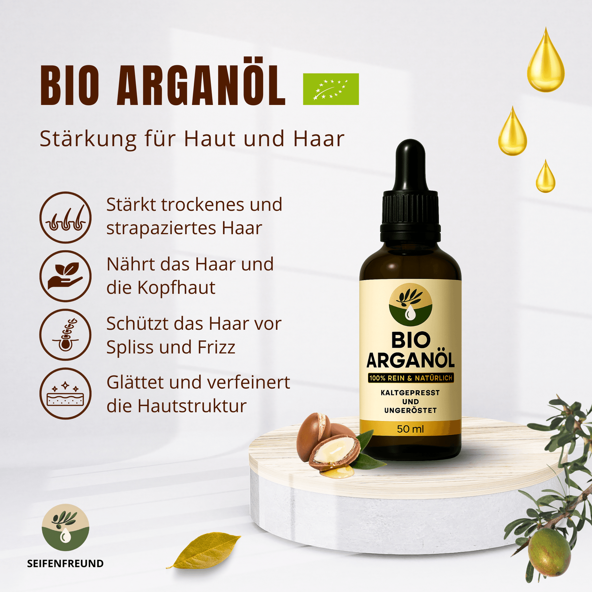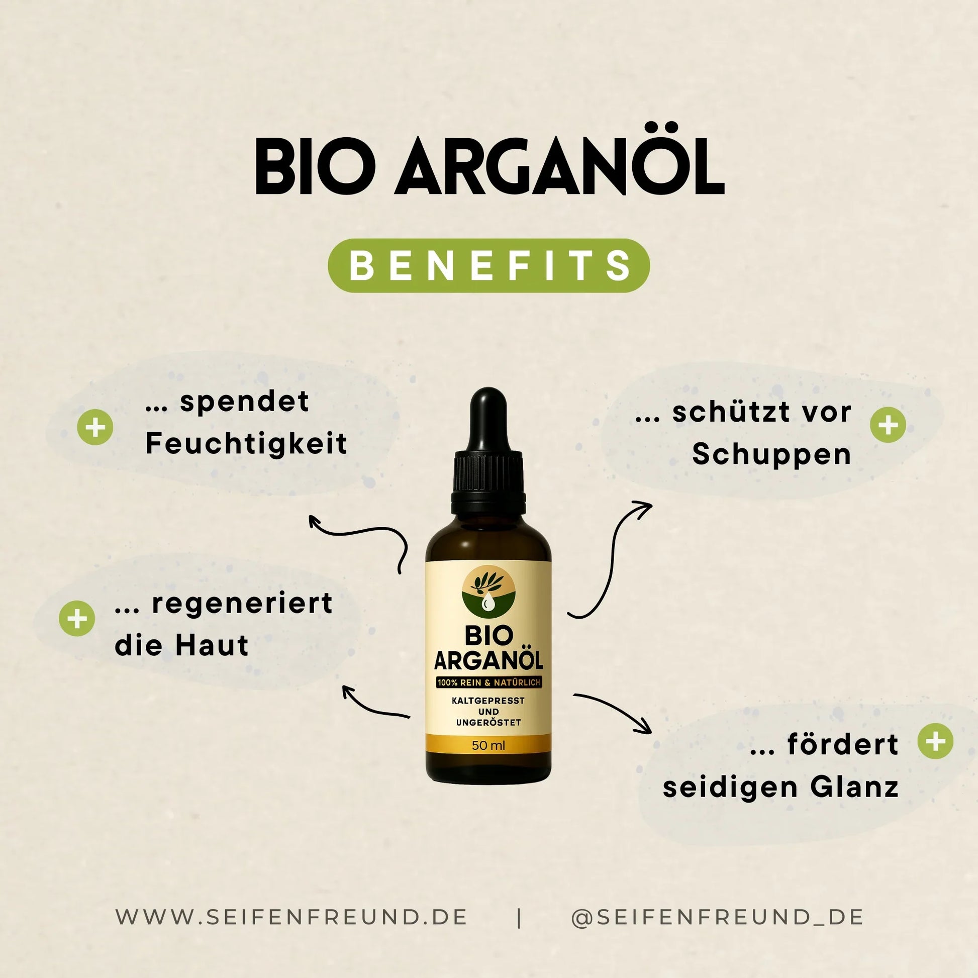 Arganöl ist reich an natürlichen Antioxidantien und Vitamin E, wodurch es die Haut regeneriert, Feuchtigkeit spendet und Hautirritationen beruhigt. Für das Haar bietet es intensive Pflege, stärkt die Haarstruktur und reduziert Frizz.