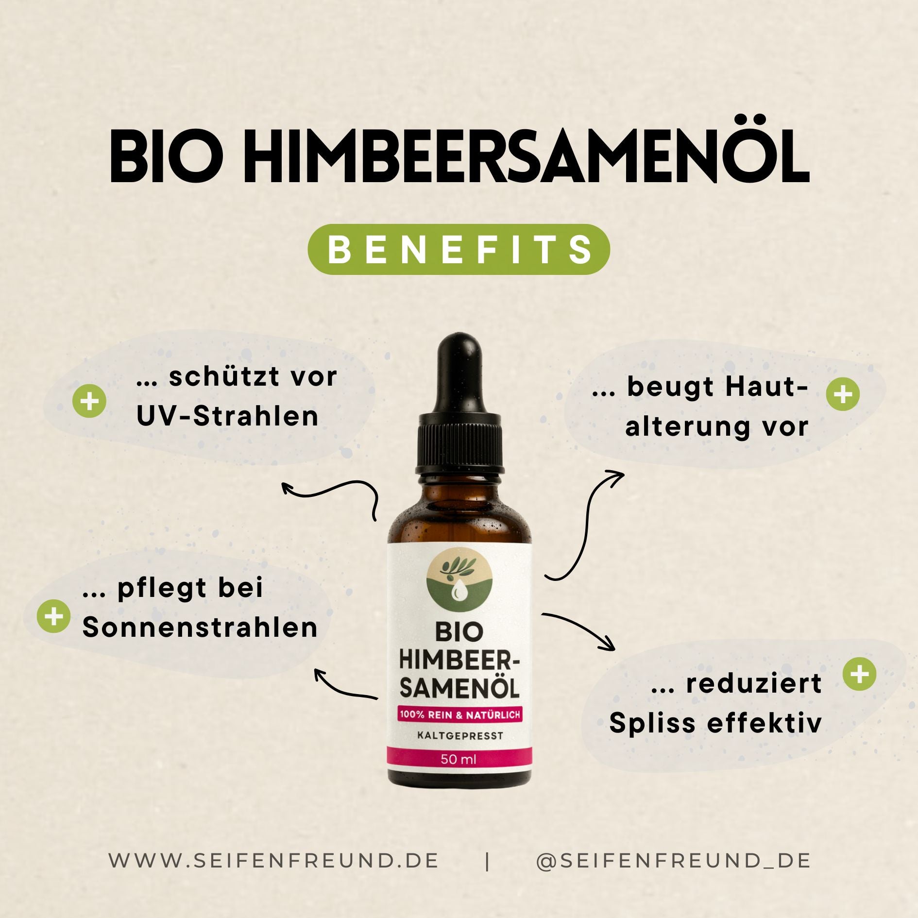 Himbeersamenöl eignet sich ideal zur täglichen Pflege von Gesicht, Körper und Haar. Es beruhigt sensible Haut, schützt vor Umwelteinflüssen und sorgt für ein ausgeglichenes Hautbild.