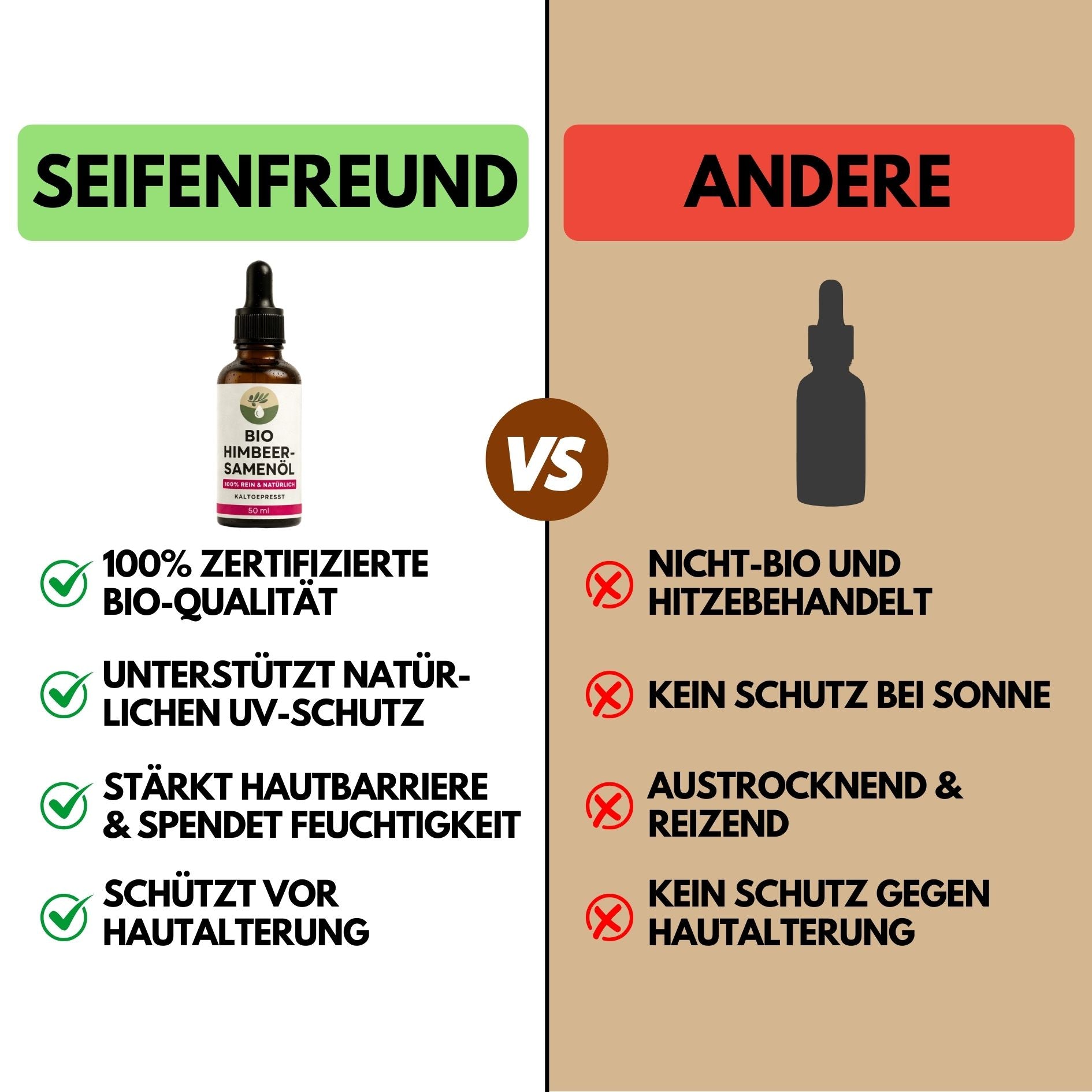 Wenn du gezielt nach einem natürlichen Sonnenschutz suchst, ist unser Premium Bio Sonnenöl Schutz+ ideal: Er basiert ebenfalls auf Himbeersamenöl, wurde aber speziell für den UV-Schutz mit einer abgestimmten Mischung aus weiteren BIO zertifizierten Pflanzenölen entwickelt.