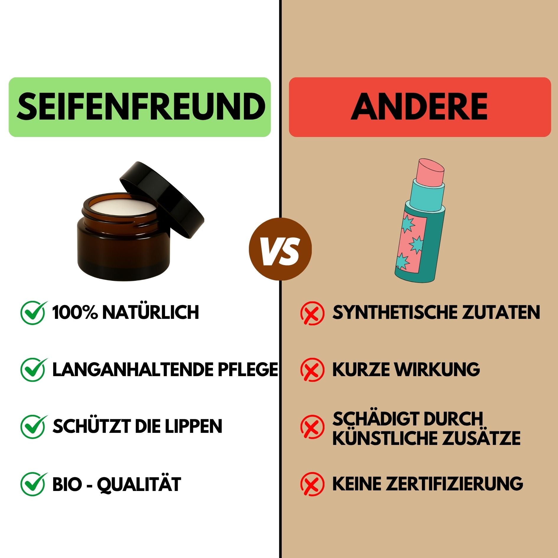 Im Gegensatz zu vielen herkömmlichen Lippenpflegen enthält unser Balsam keine Mineralöle, kein Mikroplastik und keine synthetischen Weichmacher.